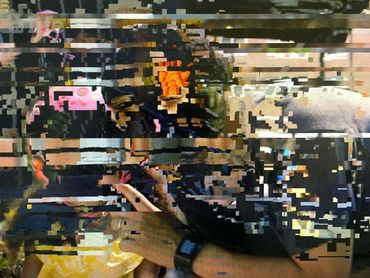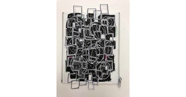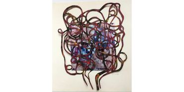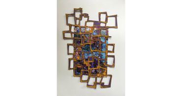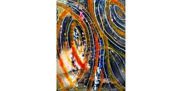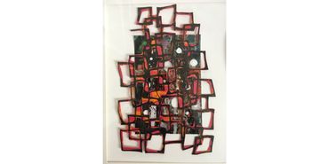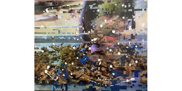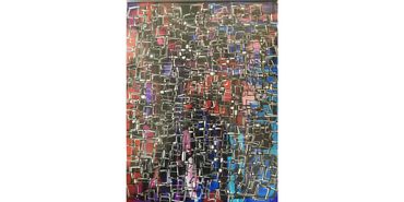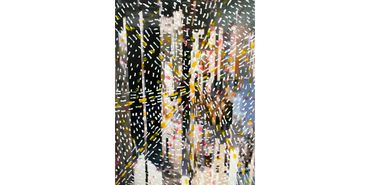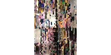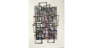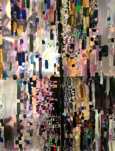When snow storms, wind, and rain caused the electronic signal on Karen's television to disintegrate, she photographed the beautiful chaos that ensued. These works demonstrate the breakdown of technology. Karen added paint and collage to give structure to her colorful photographs of disintegrated images.